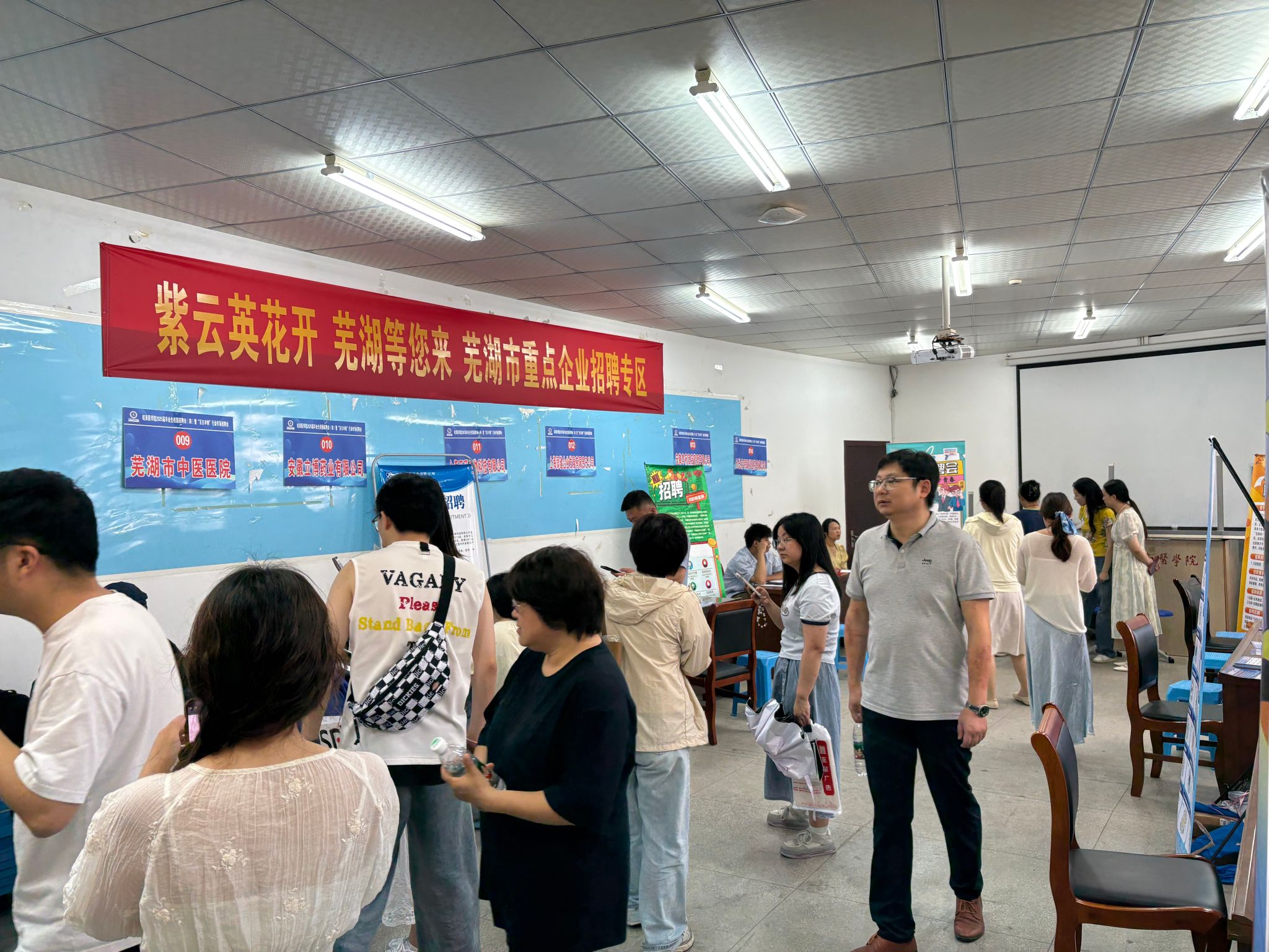 招聘会现场气氛热烈,毕业生手持定制化简历,与用人单位就职业发展、科研支持等话题展开深度对话。本次招聘会在芜湖市人才发展集团和学校教务教学等相关单位部门的大力支持下,首次设立“教学医院(基地)招聘专区”和“芜湖市重点企业招聘专区”,南京江北医院、芜湖市中医医院、安徽立博药业有限公司等单位开发了面向我校毕业生的优质岗位100余个,体现了学校对2025届毕业生既要“扶上马”也要“送一程”的决心,真正做到“离校不离心,服务不断线”。