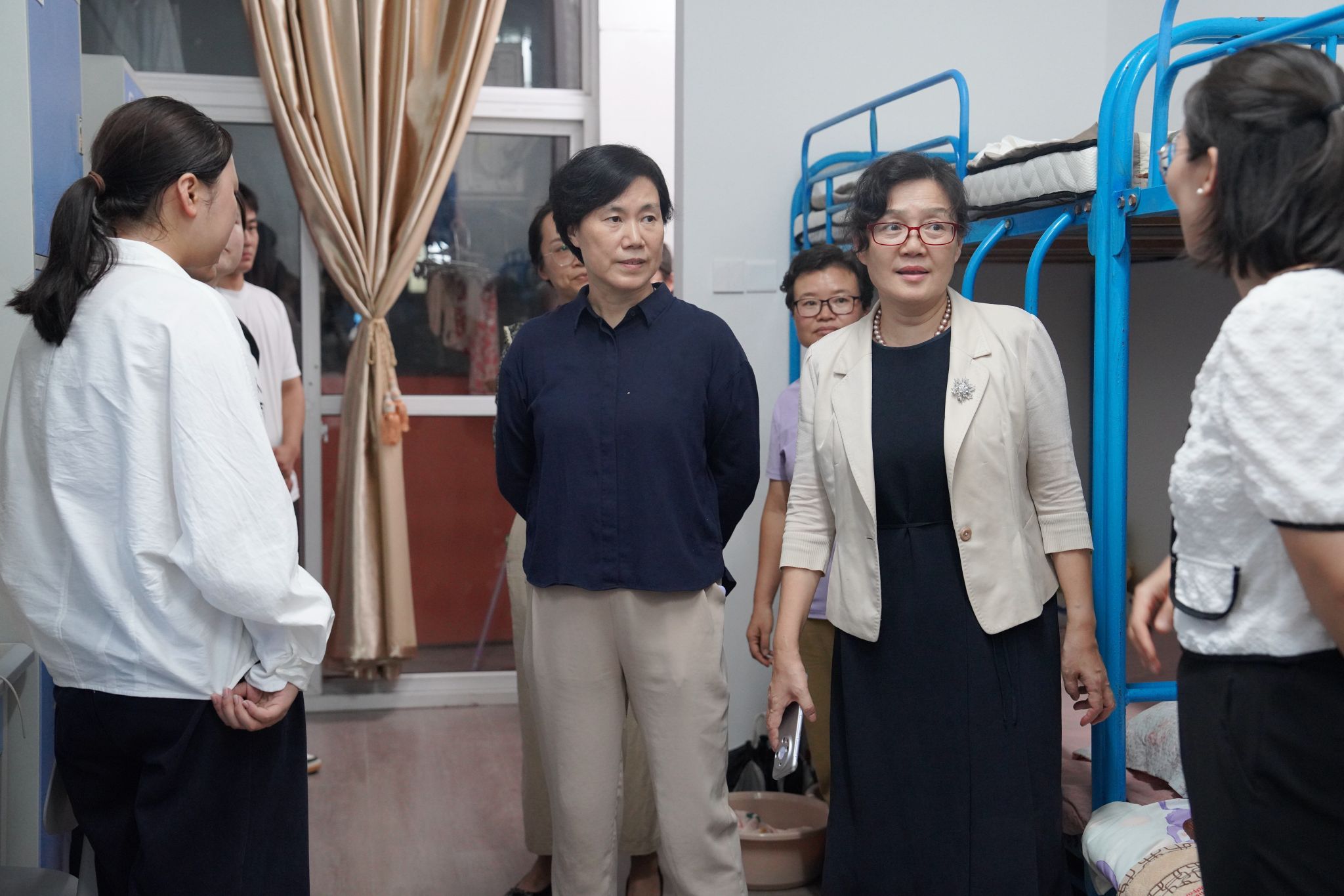 走访过程中,夏劲松与新生亲切交流,细致了解学生入住体验和实际需求,认真察看公寓设施与环境状况。她强调,要始终坚持以学生为中心,持续改善住宿条件,优化服务保障,为新生营造温馨、便捷、安全的生活学习环境。