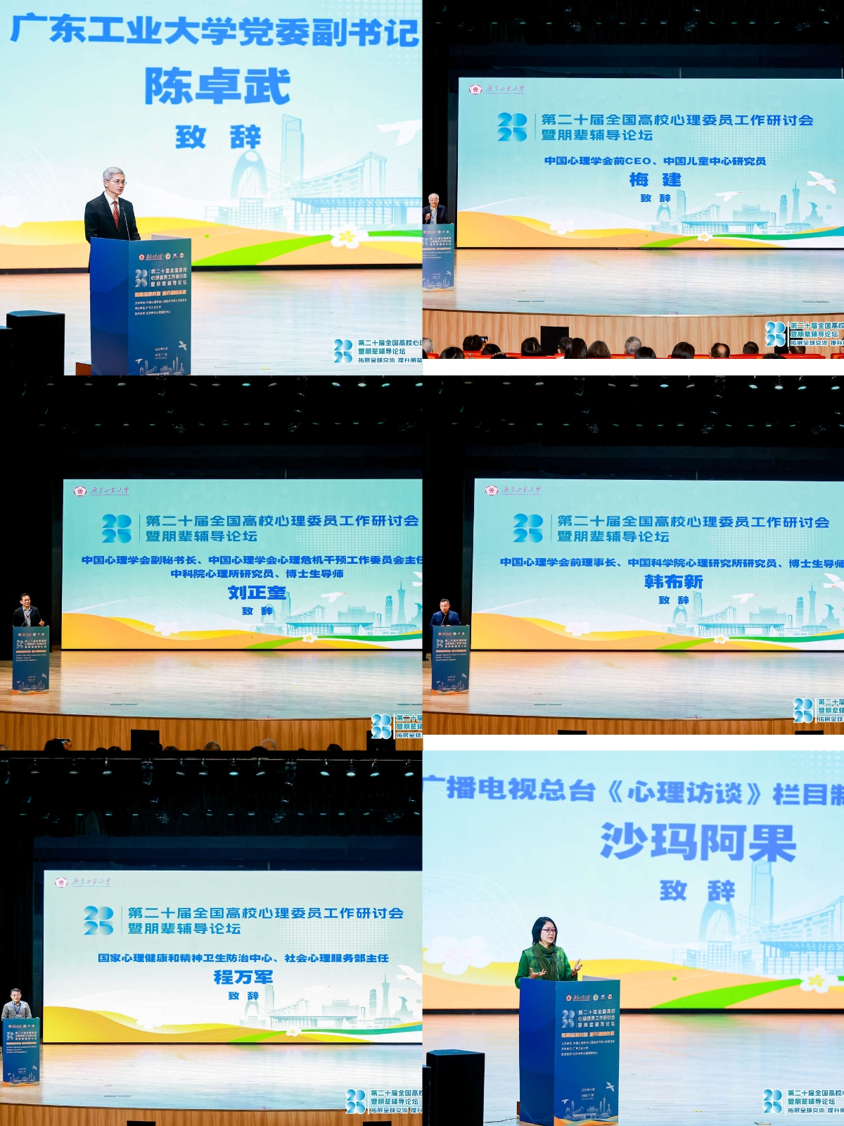广东工业大学党委副书记陈卓武致辞并介绍广东工业大学心理委员工作的成果,中国心理学会前CEO梅建研究员、中国心理学会前理事长韩布新、国家心理健康和精神卫生防治中心社会心理服务部主任程万军、中国心理学会心理危机干预工作委员会主任刘正奎、中央广播电视总台《心理访谈》制片人沙玛阿果等专家学者相继致辞,回顾心理委员建设历程,以希望之光来比喻心理委员的重要力量,阐述传播心理健康知识的重要意义。