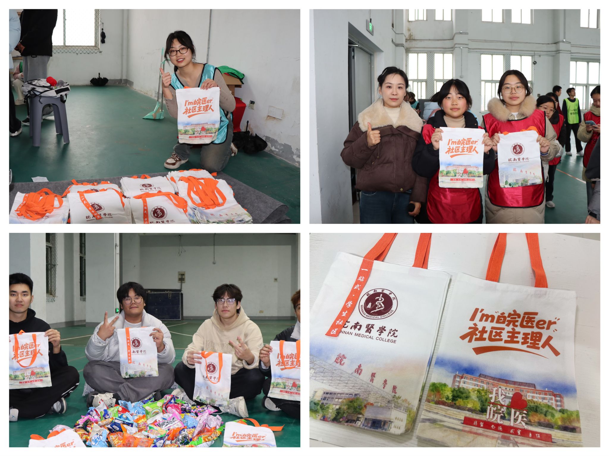 为深化学生“自我管理、自我服务、自我教育、自我监督”的“四自”意识,社区服务站在赛前广泛征集意见,同步推出“一站式”学生社区专属文创包。文创包以清新灵动的水彩校园景观为设计元素,描绘出皖医学子的日常学习与生活图景。包身印有醒目的“I’m皖医er”标语,传递出强烈的身份认同与归属感;飘带处标注的“一站式学生社区”标识,旨在鼓励学生主动参与社区建设,积极担当社区生活的组织者、服务者和引领者。